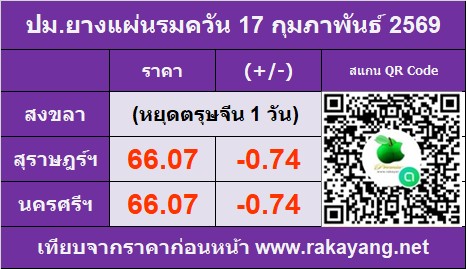 ส่วนราคาเฉลี่ยยางแผ่นรมควันคุณภาพดีวันนี้ 66.07 บาท/กก. ราคาเฉลี่ยลดลง -0.31 บาท/กก. จากวันก่อนหน้านี้