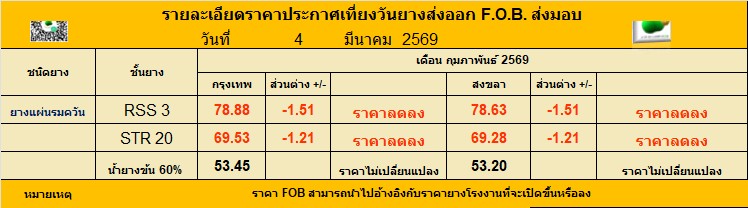 รายละเอียดราคาประกาศเที่ยงวันยางส่งออก F.O.B. ส่งมอบ ประจำวัน พุธ ที่ 4 มีนาคม 2569