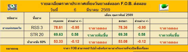 รายละเอียดราคาประกาศเที่ยงวันยางส่งออก F.O.B. ส่งมอบ ประจำวัน ศุกร์ ที่ 6 มีนาคม 2569
