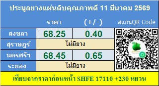 ราคาประมูลแผ่นดิบ : ตลาดสงขลา 68.25 บาท/กก. ราคาเพิ่มขึ้น 0.40บาท/กก. ปริมาณยาง 0 กก.
