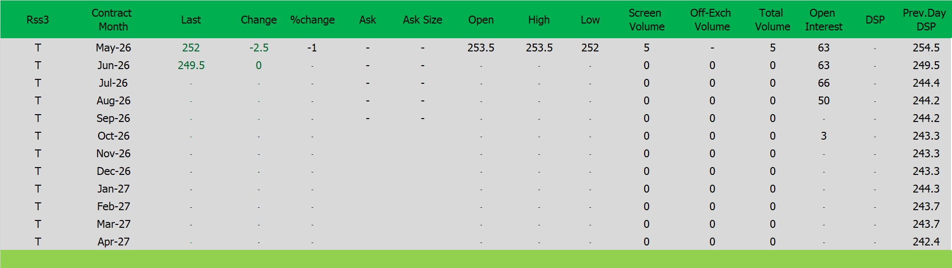 ราคายางRSS3 ตลาดยางSICOM ราคาส่งมอบเดือน พ.ค.ปิดที่252 เซนต์สหรัฐ ราคาลดลง -2.5 เซนต์สหรัฐหรือ คิดเป็นเปอร์เซนต์ -0.98% %