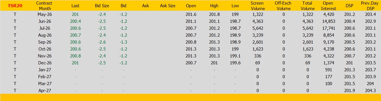 ราคายางTSR20 ตลาดยางSICOM ราคาส่งมอบเดือน พ.ค.ปิดที่201 เซนต์สหรัฐ ราคาลดลง -2.4 เซนต์สหรัฐหรือ คิดเป็นเปอร์เซนต์ -1.18% %