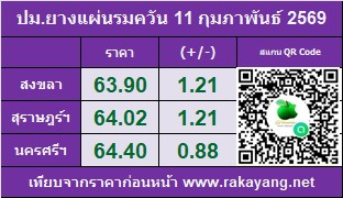 ราคาประมูลแผ่นรมควัน: ตลาดสงขลา 63.9 บาท/กก. ราคาเพิ่มขึ้น 1.21 บาท/กก. ปริมาณยาง 81,567 กก.