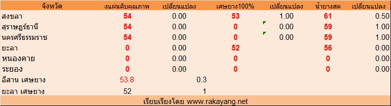 จังหวัด สงขลา ยางแผ่นดิบคุณภาพ 3 = 54บาท/กก. ราคาไม่เปลี่ยนแปลง เศษยาง 53บาท/กก. ราคาเพิ่มขึ้น 1 บาท/กก. น้ำยางสด ราคา ณ โรงงาน 61บาท/กก. ราคาเพิ่มขึ้น 0.50บาท