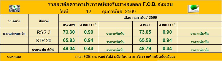 รายละเอียดราคาประกาศเที่ยงวันยางส่งออก F.O.B. ส่งมอบ ประจำวัน พฤหัสฯ ที่ 12 กุมภาพันธ์ 2569
