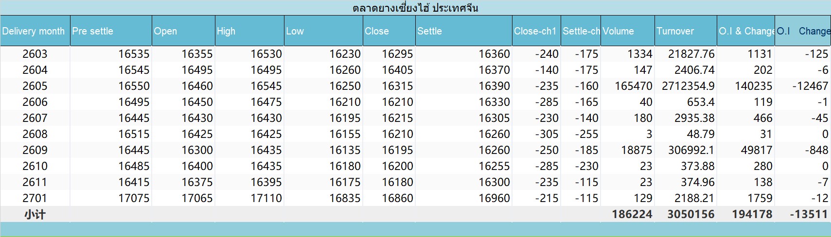 ส่วนราคา settle ของยางเซี่ยงไฮ้ SHFE เดือนส่งมอบม.ค.-26 อยู่ที่ 16,390หยวน/ตัน ลดลง-160 หยวน/ตัน หรือ -0.97%