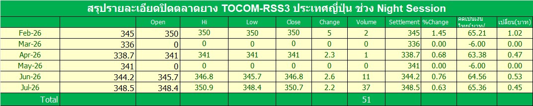 TOCOM-RSS3 ปิดตลาดช่วง Night Session ประจำวัน พุธ ที่ 18 กุมภาพันธ์ 2569 ราคาเดือน ก.ค.-2026ปิดตลาดที่ 350.70 เพิ่มขึ้น 2.2เยน ปริมาณ 37 สัญญา