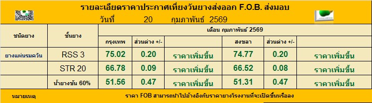 รายละเอียดราคาประกาศเที่ยงวันยางส่งออก F.O.B. ส่งมอบ ประจำวัน ศุกร์ ที่ 20  กุมภาพันธ์  2569