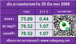 ราคาประมูลแผ่นรมควัน: ตลาดสงขลา 75.89 บาท/กก. ราคาเพิ่มขึ้น 0.44 บาท/กก. ปริมาณยาง 19,773 กก.