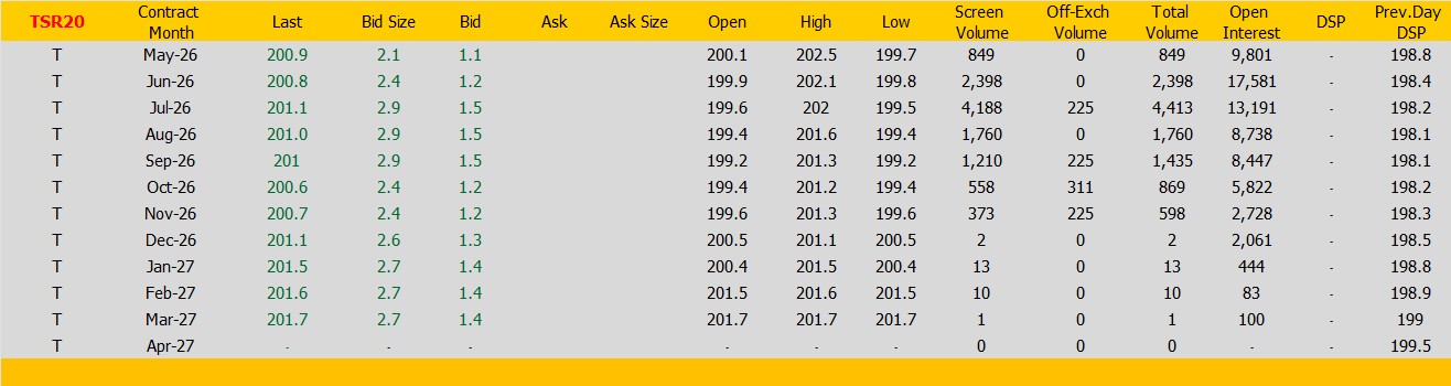 ราคายางTSR20 ตลาดยางSICOM ราคาส่งมอบเดือน พ.ค.ปิดที่200.9 เซนต์สหรัฐ  ราคาเพิ่มขึ้น 2.1 เซนต์สหรัฐหรือ คิดเป็นเปอร์เซนต์ +1.06% %