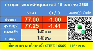 ราคาประมูลแผ่นดิบ : ตลาดสงขลา 77 บาท/กก.  ราคาลดลง -1.00บาท/กก.  ปริมาณยาง   360 กก.