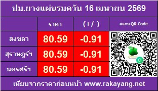 ราคาประมูลแผ่นรมควัน: ตลาดสงขลา 80.59 บาท/กก. ราคาลดลง -0.91 บาท/กก. ปริมาณยาง 86,238 กก.